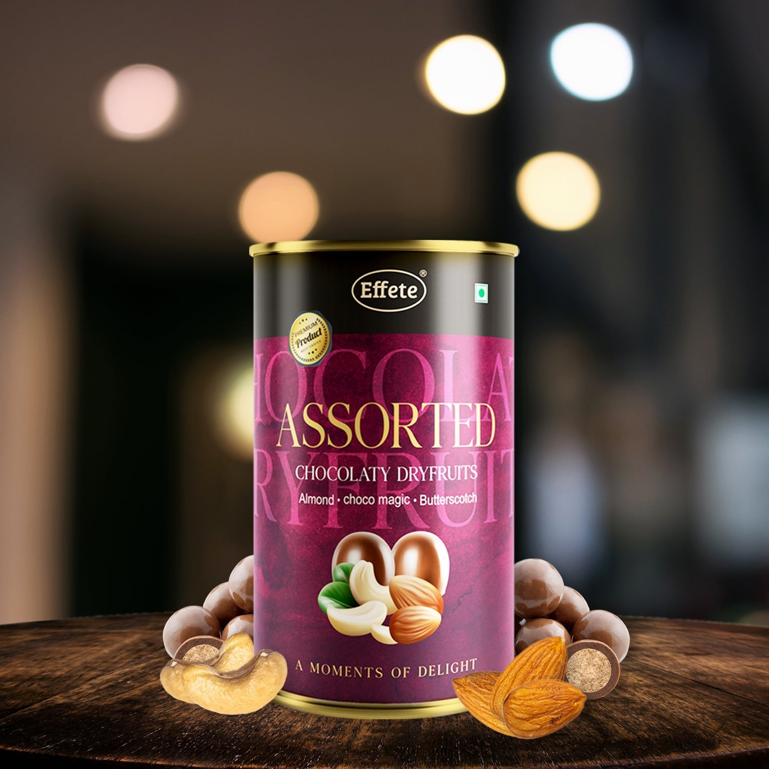 assorted chocolate dry fruits, mixed dry fruits with chocolate, choco coated nuts,chocolate almond cashew mix,snacking, premium treats, festive snacks, gifting,premium gift pack, festive gift, dry fruit gift box, celebration gift, sweet gift hamper,Diwali gift, Rakhi gift, Bhai Dooj gift